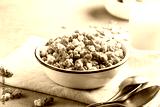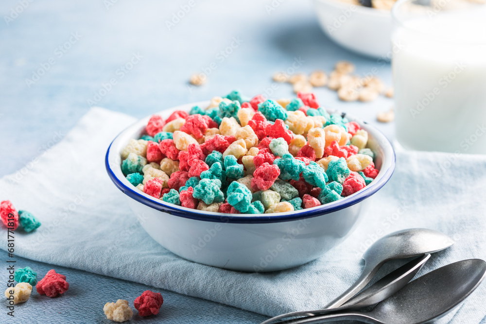 The concept of a healthy breakfast of vegetarian yogurt, whole grain cereal fresh fruit on a blue table against a white kitchen background. Front view.