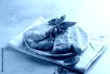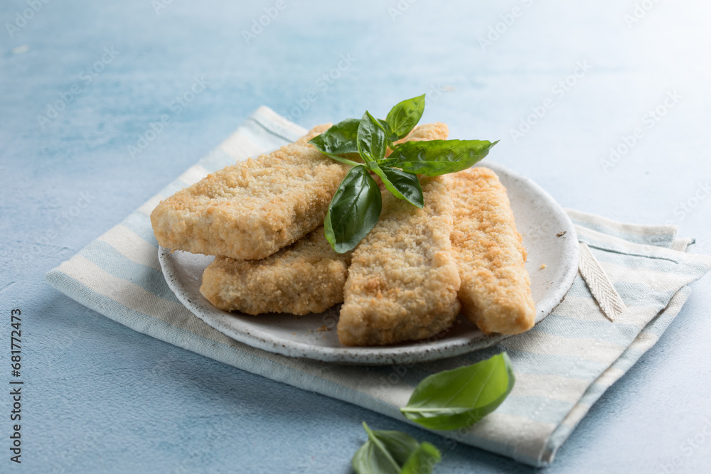 Fish fingers and Chips british fast food seafood sticks. Gray background. Top view