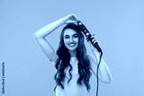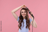 Beautiful young woman using curling hair iron on pink background