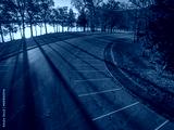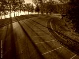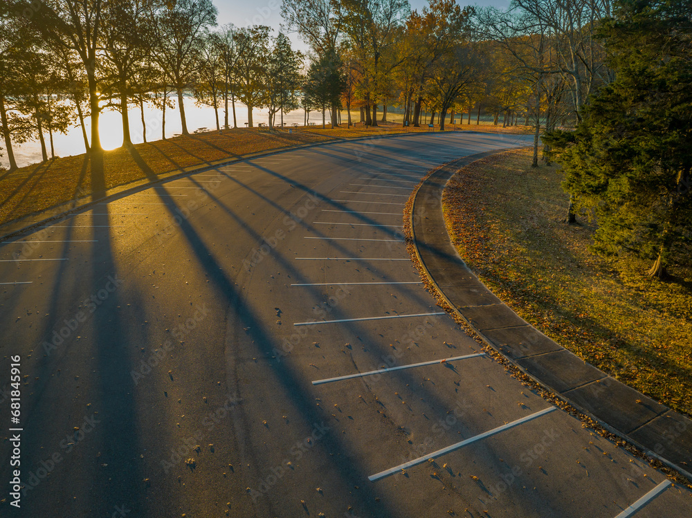 sunrise over the Tennessee RIver and parking lot in Colbert Ferry Park, Natchez Trace Parkway, aerial view of fall scenery