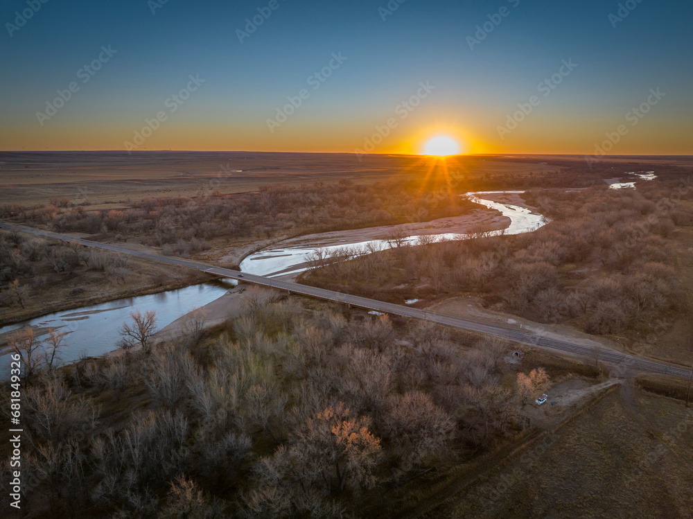 sunset over prairie and the South Platte River in eastern Colorado near Crook, aerial view of late November scenery