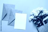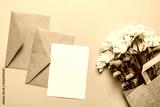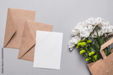 Two craft envelopes, a blank form and a bouquet of white chrysanthemums in a gift bag on a gray background. Postcard, mock-up.