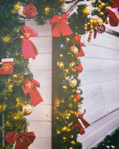 Christmas or New Year's market in a Europe with houses decorated with toy balls and garlands at night. Vintage film aesthetic.