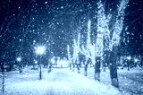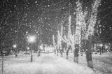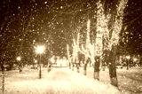 Snowfall in a winter park at night with decorations, glowing lanterns, pavement covered with snow and trees. Vintage film aesthetic.