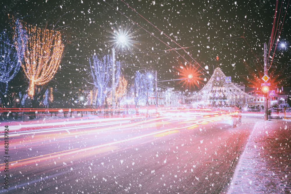 Night winter city with Christmas or New Year decorations, spruce and traces of headlights of moving cars in a snowfall. Vintage film aesthetic.