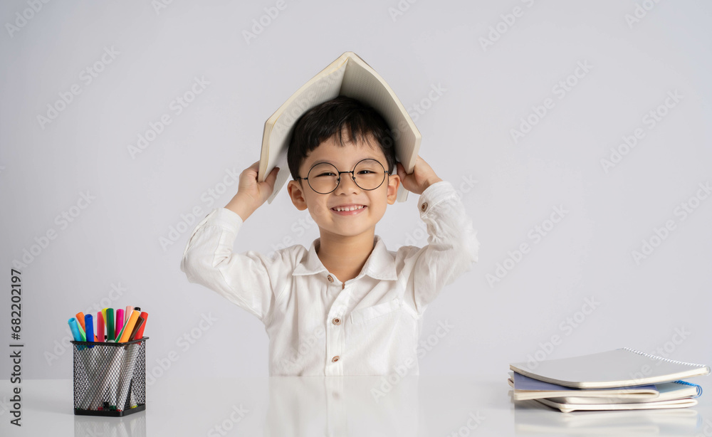 Portrait of an Asian boy studying on a white background
