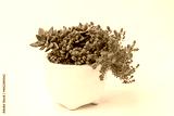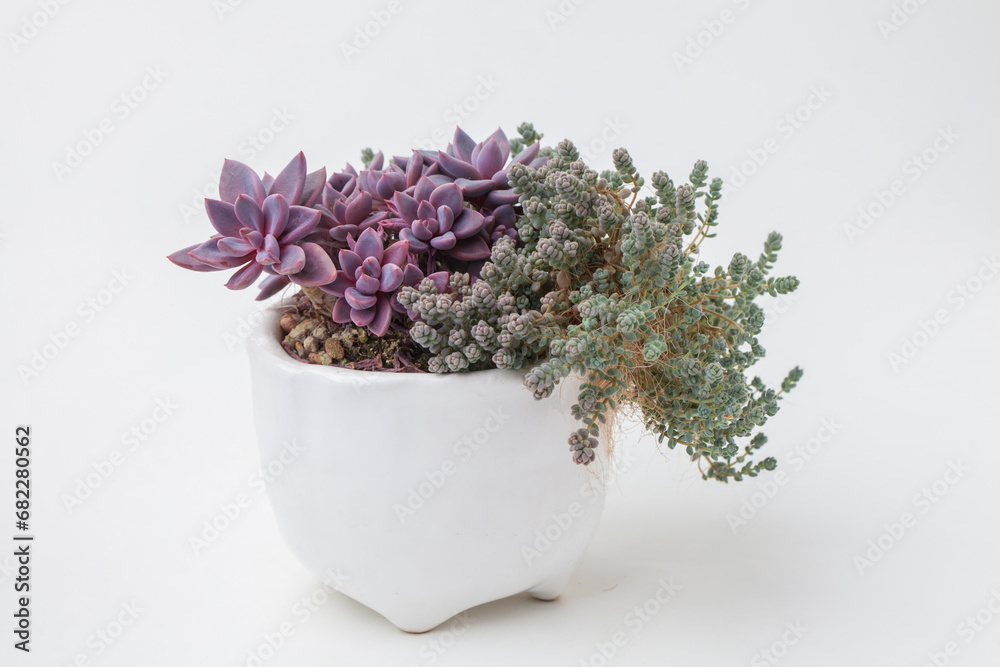 Green and purple houseplant in white ceramic pot on white background. Echeveria sugar jelly and sedum dasyphyllum minor on white background