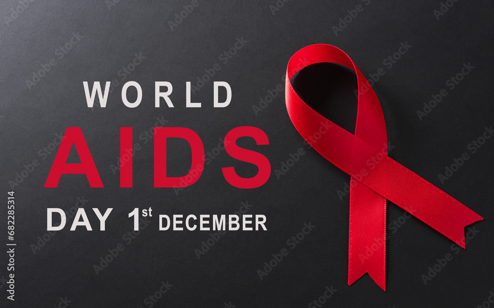Closeup red ribbon HIV, world AIDS day awareness ribbon on black background. Healthcare and medicine concept.