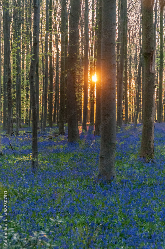 The rising sun illumingating a flowerbed of bluebells in the Hallerbos, on an early spring morning.