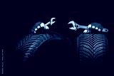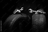 Winter car tires service and hands of mechanic with wrench, screwdriver on black background.