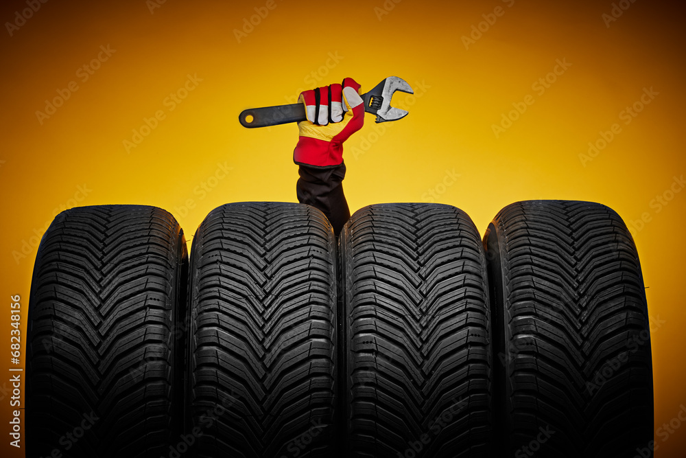 Winter car tires and hand of mechanic with wrench, screwdriver, automobile services.