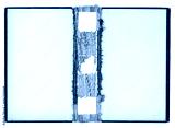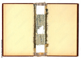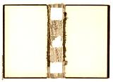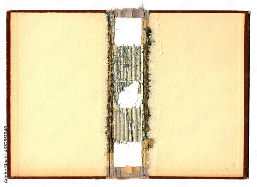 Aufgeklapptes zerstörtes Buch mit vergilbten Buchdeckeln