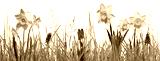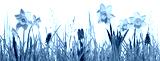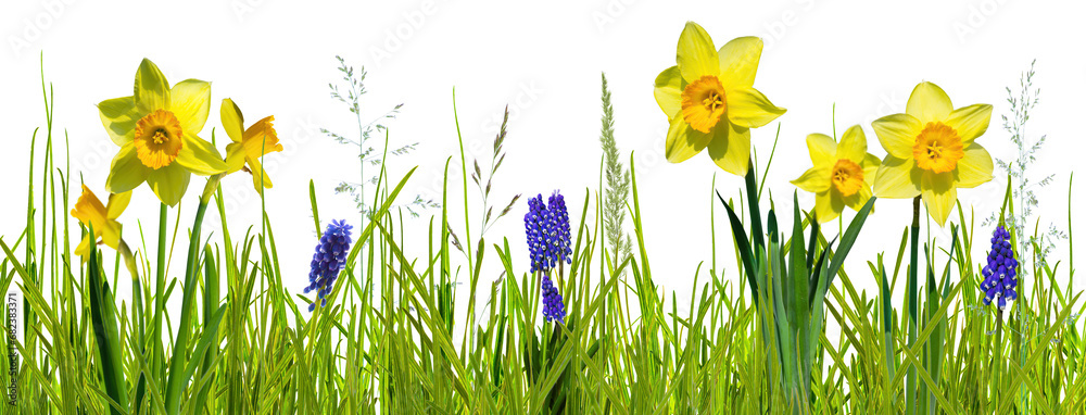 abstract spring meadow with easter flowers daffodils and blue grape hyacinth isolated on transparent background, texture template overlay decoration for springtime