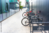 Sleek Bike Rack with Bicycles by a Modern Office Building