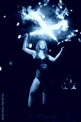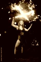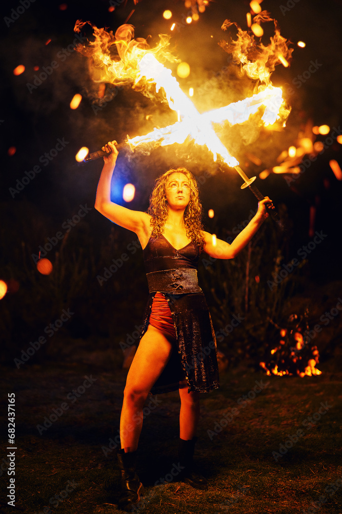portrait hispanic woman fire performer dancer holding sabers on fire