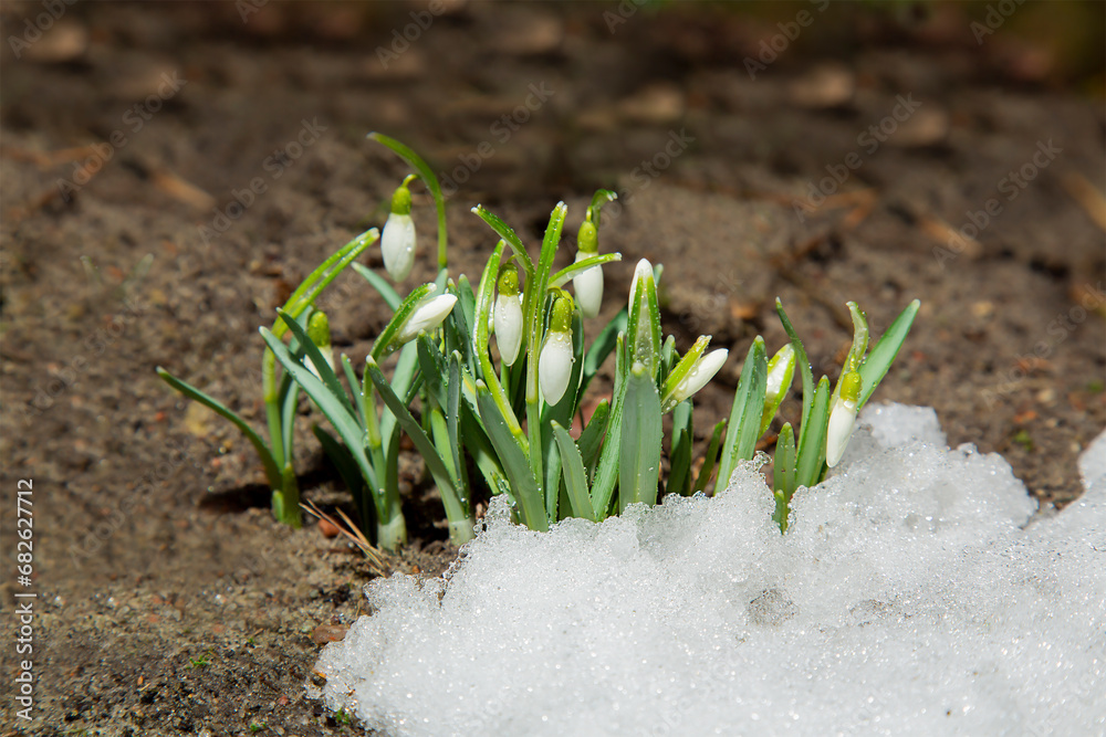 Blooming snowdrops in the snow. The first spring flowers. Wild, forest flowers.