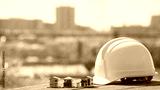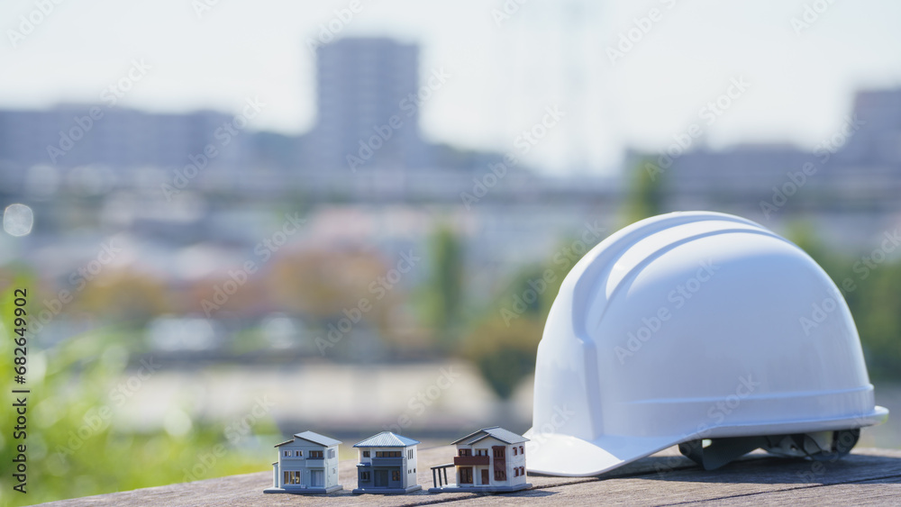 ヘルメットと模型の家と街並み