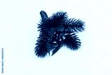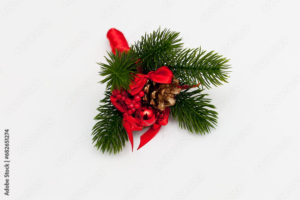 Christmas or New year card concept, pink baubles decor, green fir branch, white decorated banner free space for text.