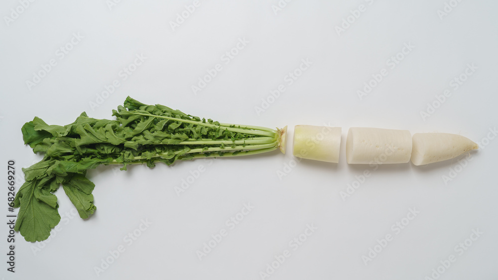 部位ごとにカットされた大根(葉・根元・中間・先端)