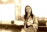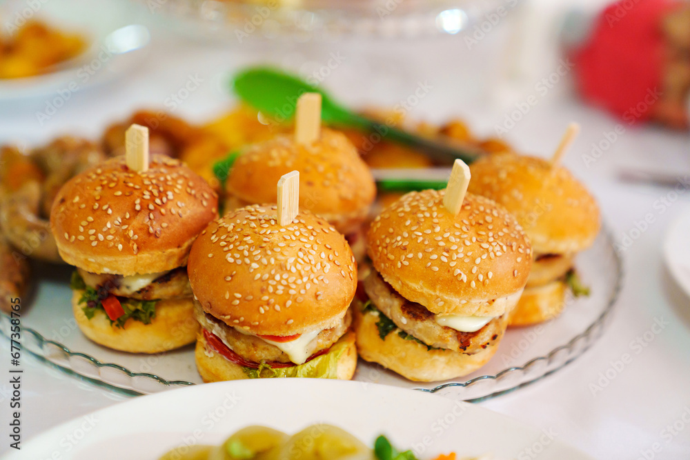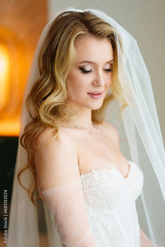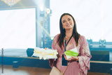 woman in a pink dress with a badge with a box of gifts for guests at the party