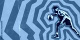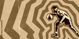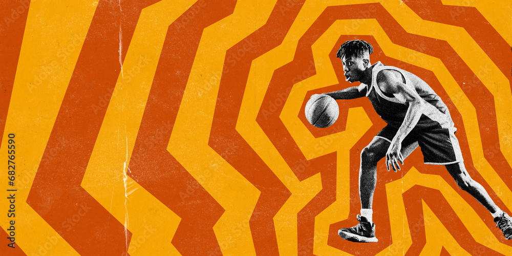 Poster. Contemporary art collage. African-American man confident training before match, dribbling against bright background. Paper filter. Minimal design