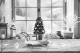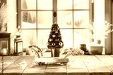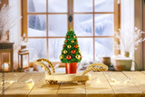 Wooden retro yellow table and blurred background of window sill. Christmas tree and empty space for your decoration. Natural light and magic time. Mockup background and cold december time.