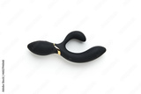 Black vibrator on the white background. Sex toys for adults. Flat lay, top view