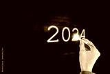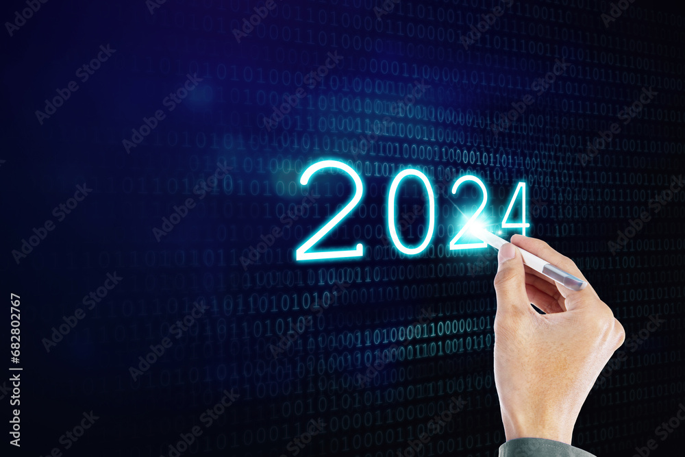 Businessman hand writing 2024 with a stylus pen over futuristic binary numbers background