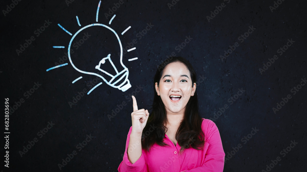 Asian woman having great idea against blackboard with lightbulb doodle