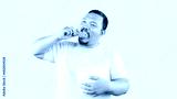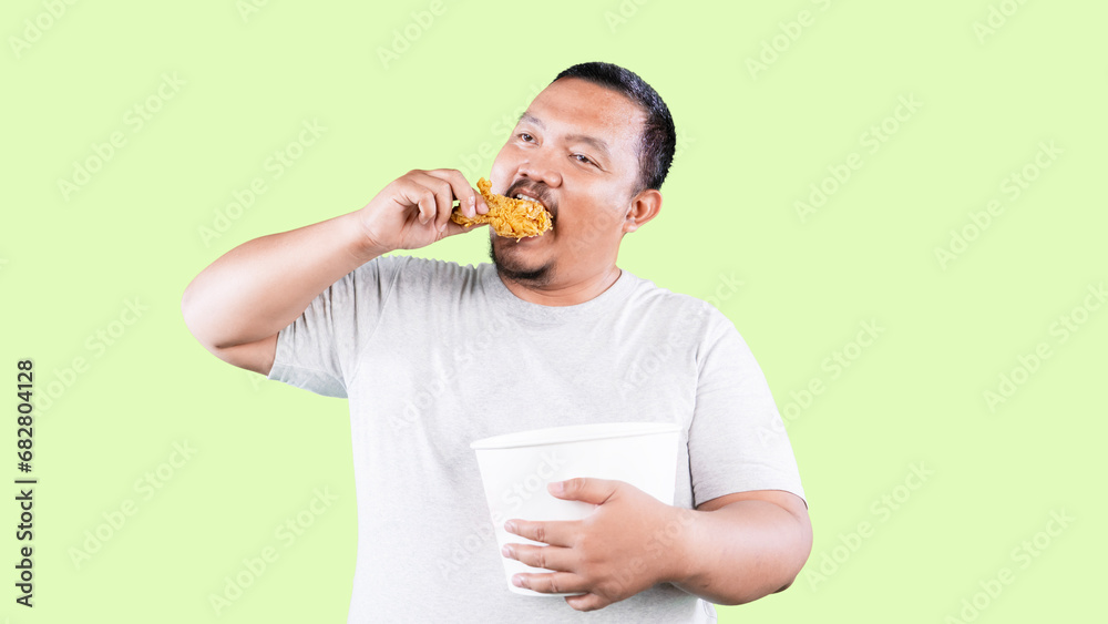Overweight Asian guy eating crispy fried chicken isolated on green background