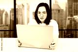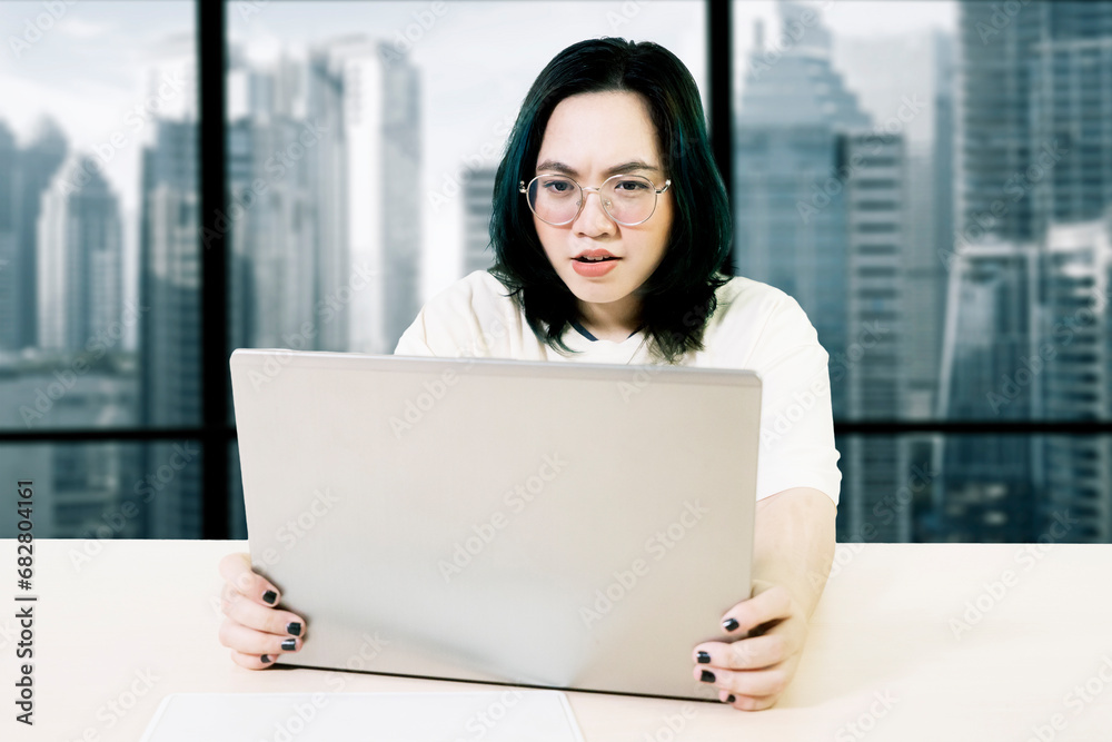 Upset woman using laptop on the desk with laptop in an office