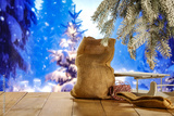 Desk of free space and winter background of pedestal. Christmas time and snow with forst decoration.