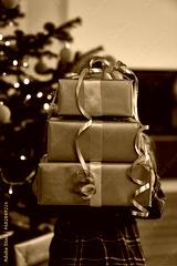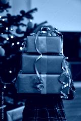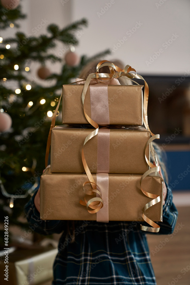 Unrecognizable caucasian girl holding a pile of presents