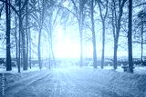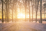 Sunset or dawn in a winter city park with trees, benches and sidewalks covered with snow and ice. Vintage film aesthetic.
