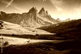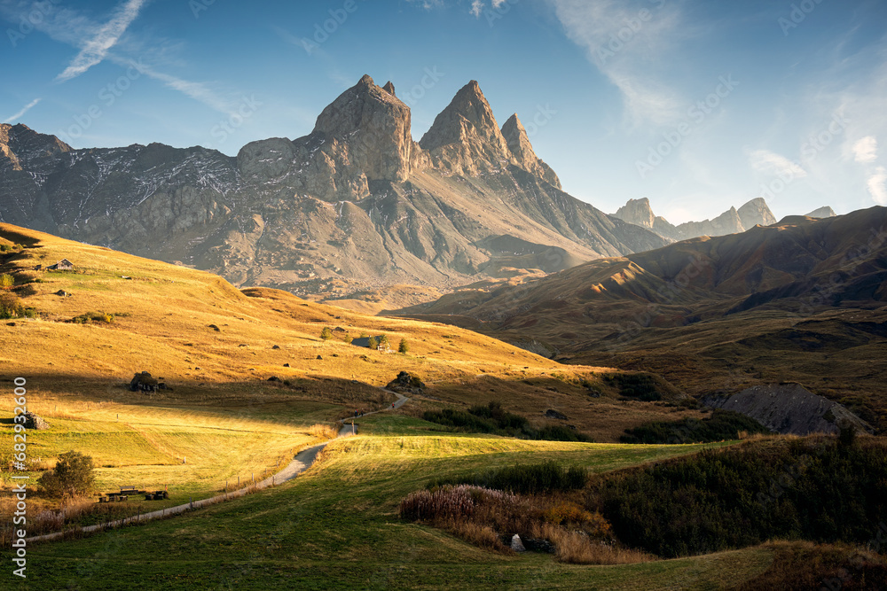 Aiguilles d Arves massif with iconic mountain peak in French Alps on autumn at Savoie, France