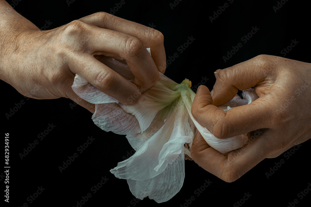 hands tearing white fragile flower, metaphor of violence abuse aggression