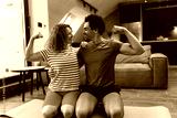 An interracial couple doing push ups together in the living room, is dressed casually and they like to exercise together