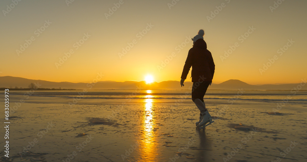 LENS FLARE, SILHOUETTE: Female ice skater gliding on golden glowing ice surface