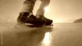 LENS FLARE, CLOSE UP: Man brakes and stops while ice skating on a frozen pond