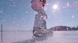 LENS FLARE, CLOSE UP: Fit young man brakes and sprays glittering flying ice
