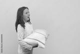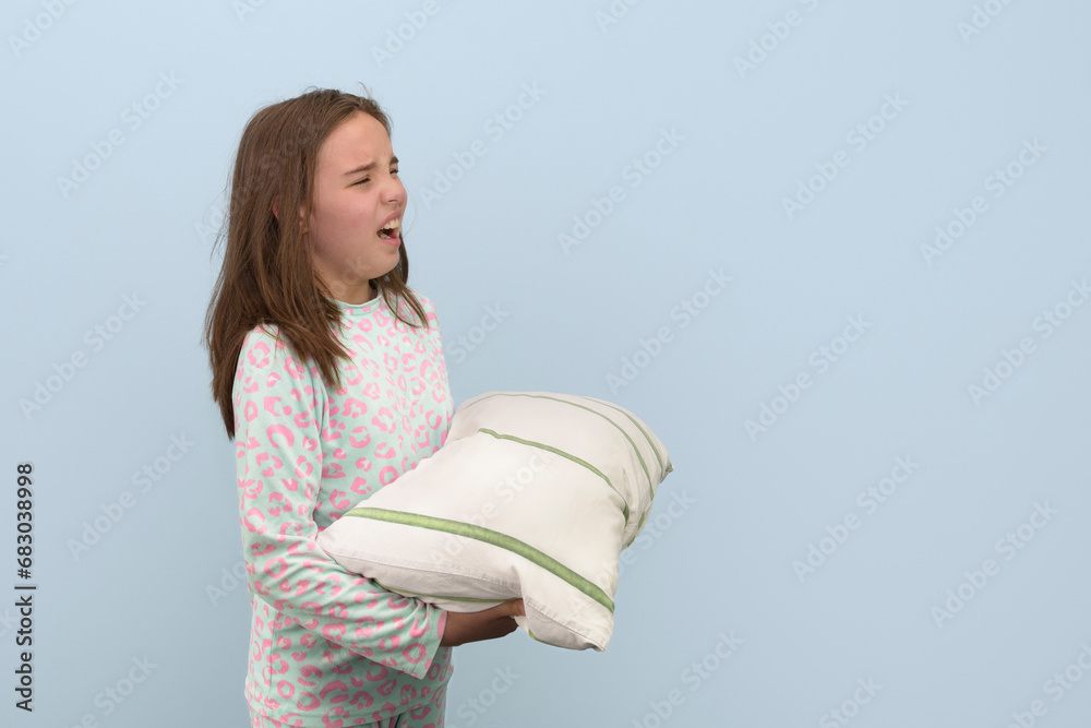 Girl yawns, with a pillow in her hands, in pajamas and disheveled hair. Light green background