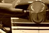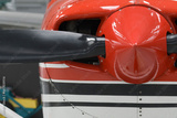 Front part of a red aircraft with a propeller. Screws, texture, surface, close-up