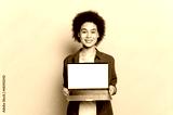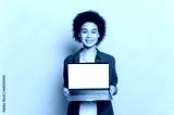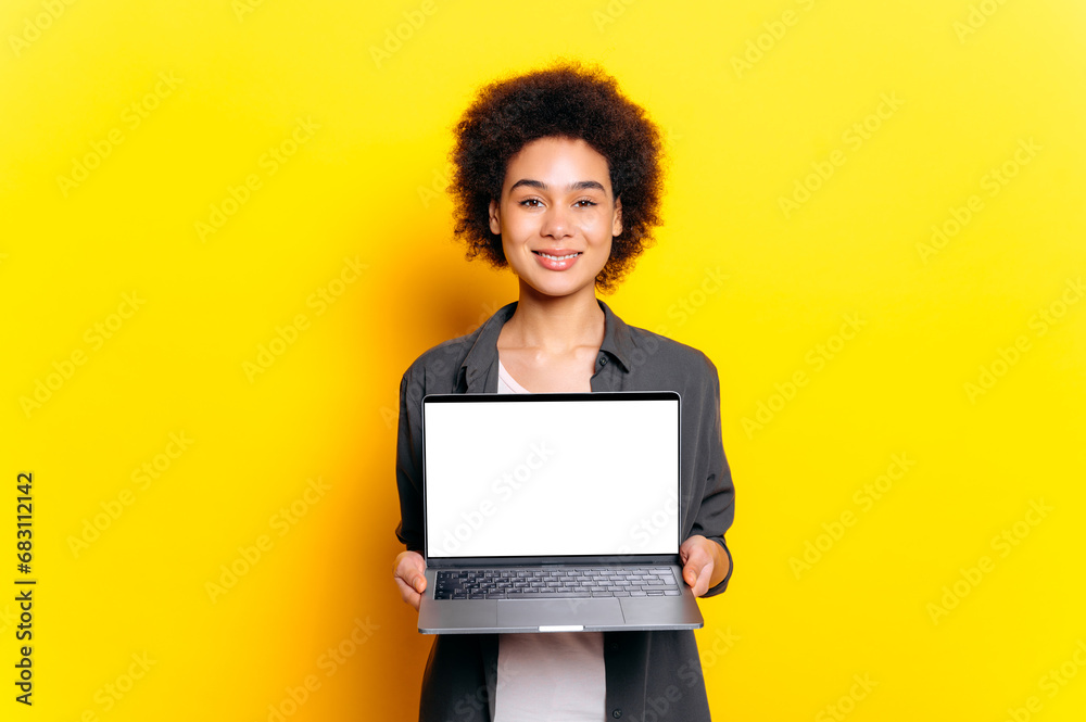 Gorgeous positive african american or brazilian woman, student, with short curly hair, holding laptop, showing white mockup screen for advertising, stand on isolated yellow background, smiling
