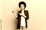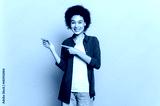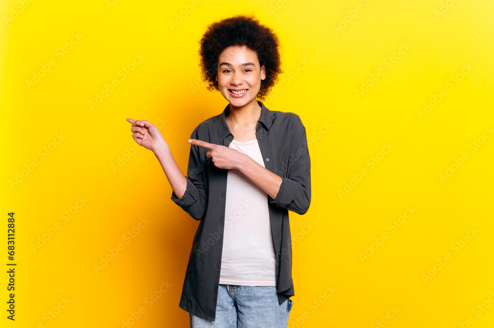 Pretty African American young woman, with short curly hair, wearing casual clothes, pointing hands to the side at empty space, stand on orange isolated background, looking at camera, smiling friendly