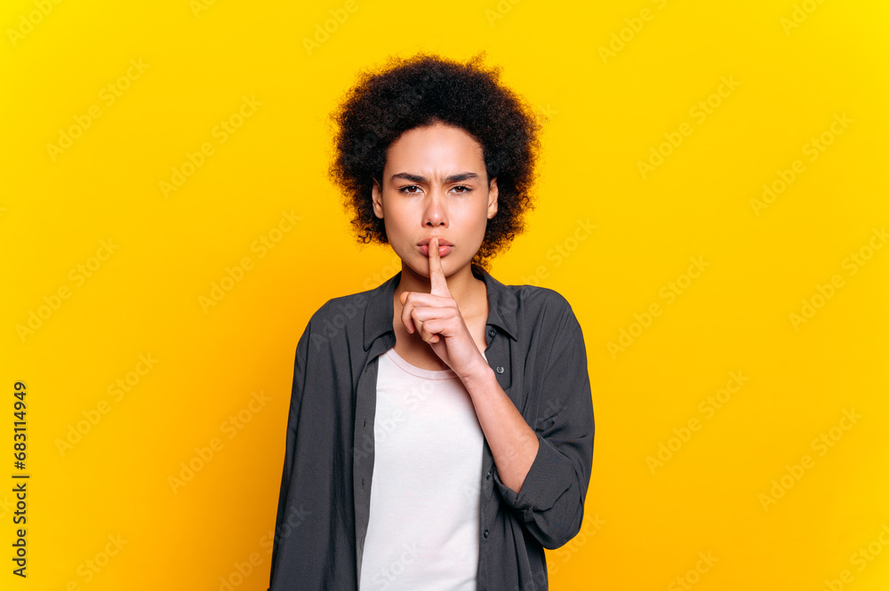 Photo of an african american woman, in casual wear, showing shh sign with forefinger touching her lips, stop talking, looks at camera, stand on isolated yellow background. Don't tell. Secret, mystery