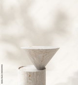 Close up modern cone white marble side table podium in sunlight, leaf shadow on beige wall. Luxury cosmetic, skincare, beauty, body, hair care, treatment, fashion product display background 3D