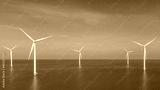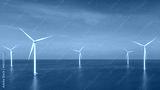 Windmill farm in the ocean Westermeerwind park, windmills isolated at sea on a beautiful bright day in Netherlands Flevoland Noordoostpolder