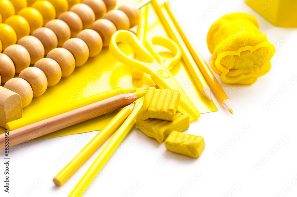 Background with yellow plasticine, colored pencils and other too
