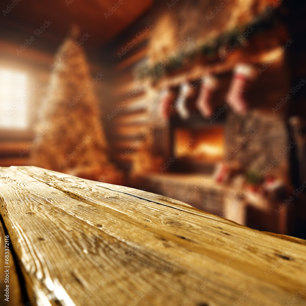 Wooden desk of free space and fireplace in home interior.