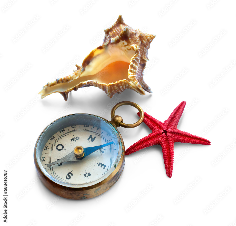 Collection of summer vacation design element. compass and seashell on a white background. PNG travel design element with real transparent shadow on transparent background.